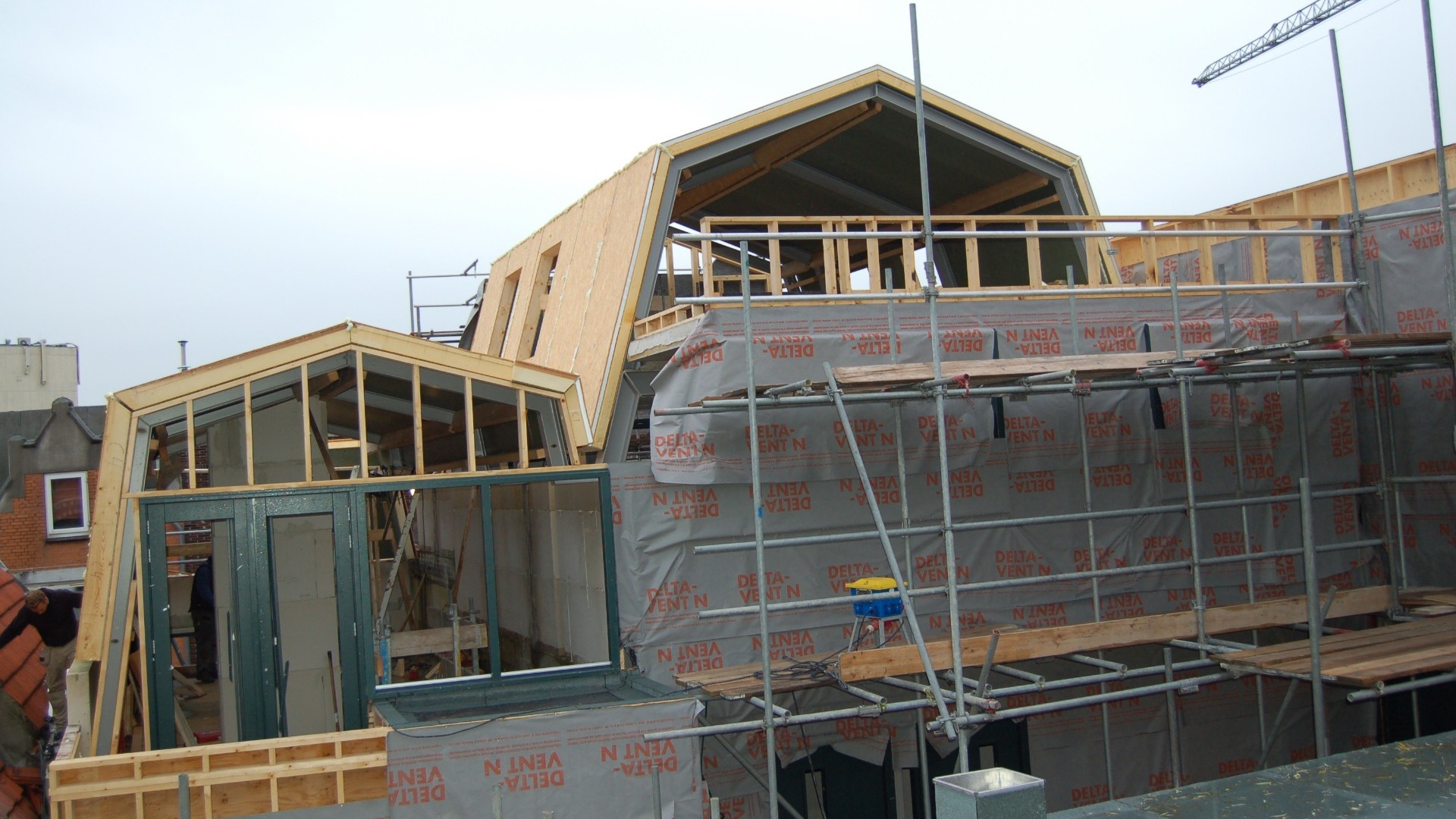 Om een duidelijke splitsing tussen "oud" en nieuw te maken is de voorgevel door middel van een glas strook los gekoppeld van de nieuwbouw. Voor de achterbouw is gekozen voor andere materialen.